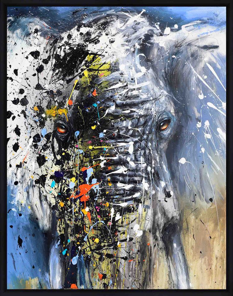 Éléphant - Original artwork done on a canvas with acrylic, ink and spray paint - Framed, signed by the artist on the front (2025).