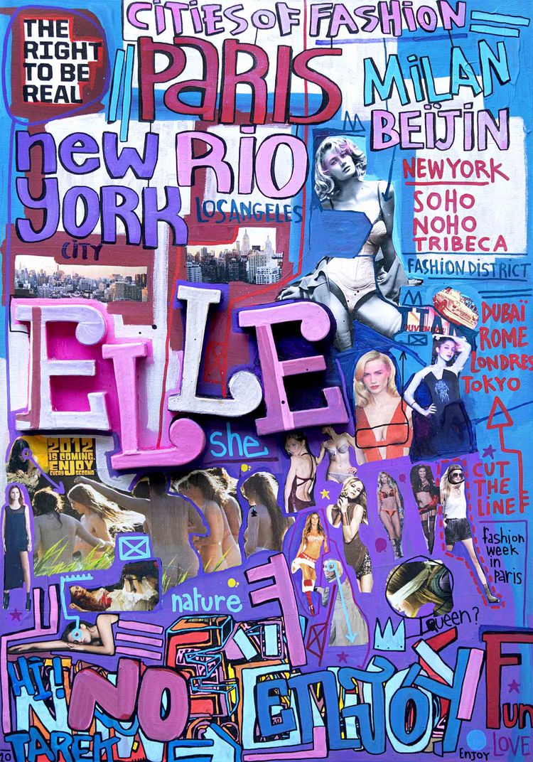 Elle - Original artwork done on wood with collages, acrylic and marker - Dated and signed by the artist on the front (2011).
