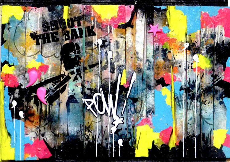 POW! Shoot The Bank on Wood - Artwork done on wood with acrylic, spray paint and ink - Dated and signed by the artist at the back (2014).