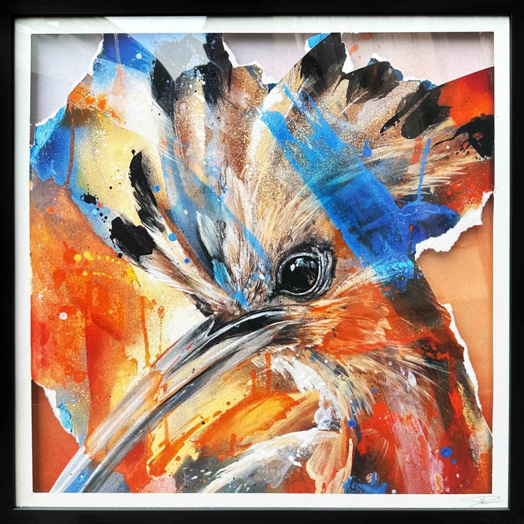 Hoopoe - Original artwork made of printed collages handpainted with acrylic and spray paint - Framed, protected by a glass and signed by the artist on the front (2025).
